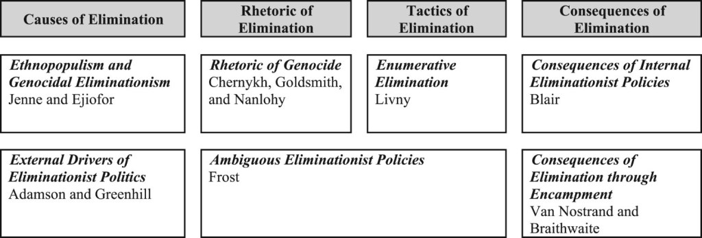 The issue opens with an introductory article I co-authored with Meghan, titled “Eliminationist Politics: An Analytical Framework”. In it, we take stock of how scholars across the social sciences conceptualize and operationalize eliminationist policies—defined as “deliberate actions by state or non-state actors aimed at destroying, removing, or erasing groups based on salient identity categories”.